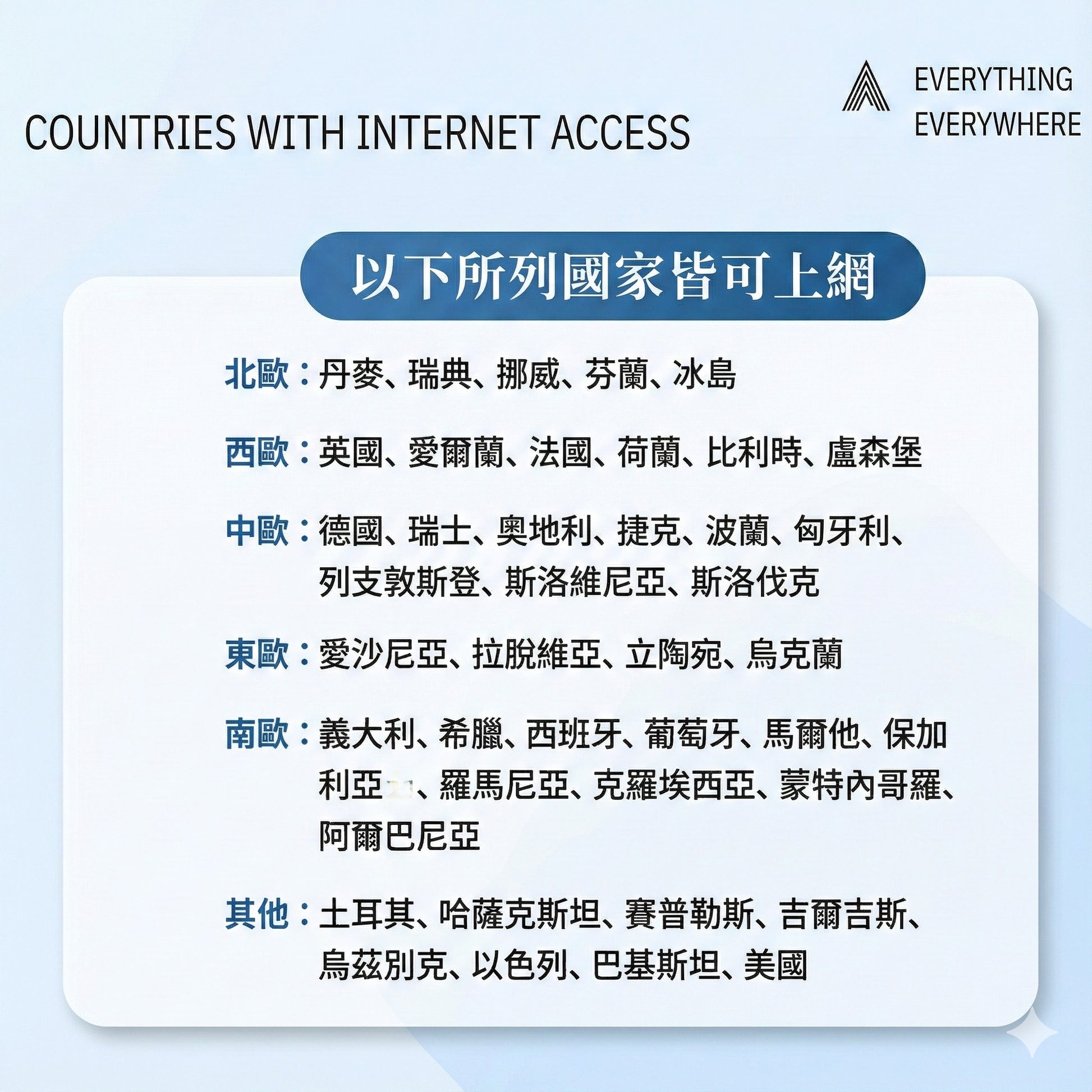 🌍 以下所列國家皆可上網